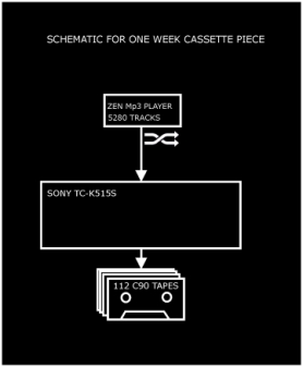 This piece uses 212 C90 cassette tapes containing approximately 163,542 tracks from this random selection. 112 x 90 is 10080 minutes or 168 hours or 7 continuous days of playback.